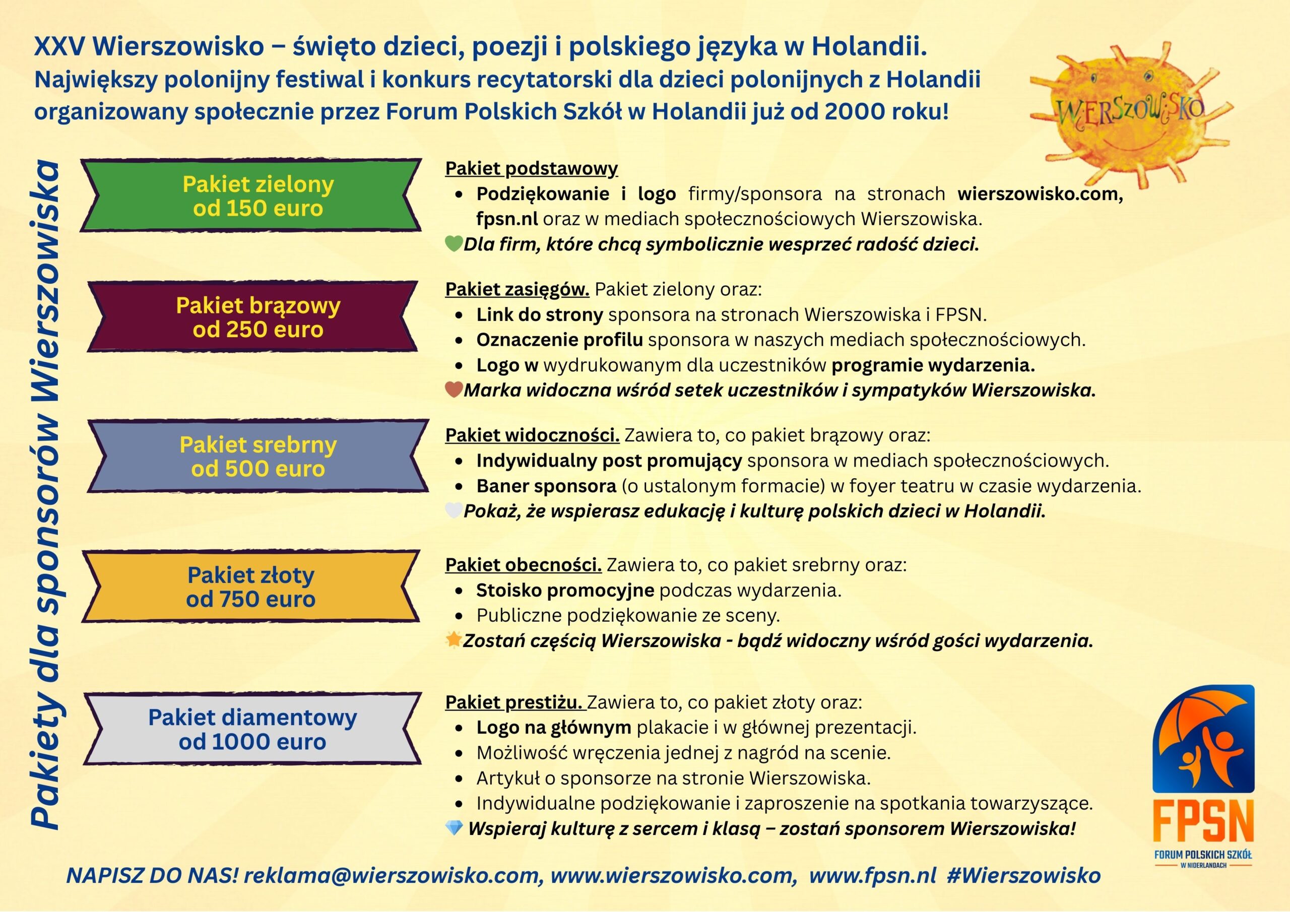 Wierszowisko jest jedynym takim ewenementem na skalę europejską, popularyzuje dokonania polskiej literatury dla dzieci, integruje uczniów, nauczycieli i rodziców wszystkich polskich szkółek na terenie Niderlandów, popierają nas inne organizacje polonijne, takie jak Stowarzyszenie Ekspertów Polskich w Holandii, Polsko-Niderlandzkie Stowarzyszenie Kulturalne oraz Scena Polska, co czyni ta imprezę przykładem wspanialej współpracy Polonii Holenderskiej.